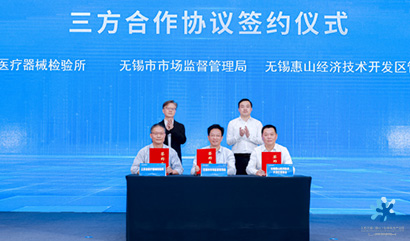省檢驗(yàn)所、市市場(chǎng)局和惠山經(jīng)開(kāi)區(qū)就合作共建惠山服務(wù)站進(jìn)行三方簽約,將從建立交流機(jī)制、明確工作職責(zé)、成立領(lǐng)導(dǎo)小組等方面做出部署,確保服務(wù)站順利建成、全面運(yùn)行,為全區(qū)醫(yī)療器械企業(yè)提供高效、專業(yè)的檢驗(yàn)服務(wù),助力惠山生命健康產(chǎn)業(yè)提檔升級(jí)。王吉東、周建輝、程松共同為服務(wù)站揭牌。